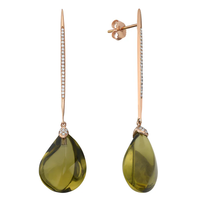 Design: Elegant drop earrings with large olive quartz stones and sparkling diamond accents for maximum brilliance