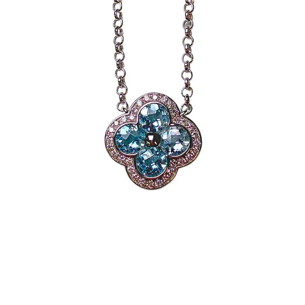 This 14K white gold clover necklace features a delicate, floral-inspired design centered with four round checkerboard-faceted blue topaz gemstones totaling approximately 1.38 carats. Surrounding the vibrant blue stones are 36 round brilliant diamonds (0.20ctw, G/H color, VS2–SI1 clarity) that add a refined sparkle. Suspended from a graceful chain, this necklace blends timeless charm with a touch of modern elegance. The chain length is 16 inches.