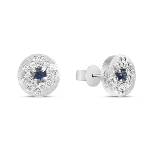 Add a refined pop of color to your everyday look with these 14K white gold disc stud earrings, designed to blend classic elegance with modern charm. Featuring vibrant round sapphires accented by sparkling round brilliant-cut diamonds, these studs offer balanced brilliance and rich color in a sleek, easy-to-wear silhouette—perfect for daily wear or effortless sophistication.