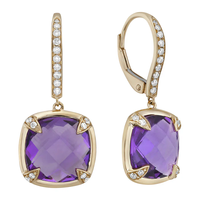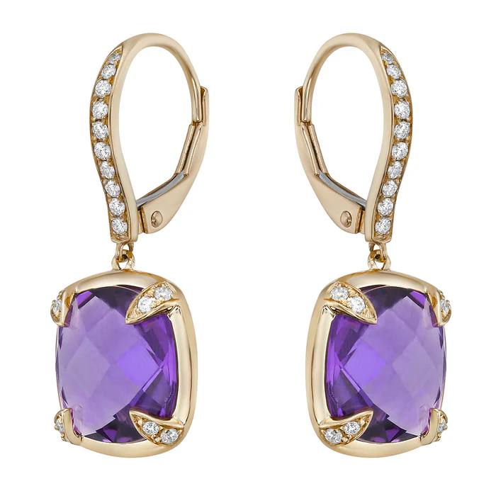 Design: Elegant dangle earrings with striking amethyst drops framed by sparkling diamond details