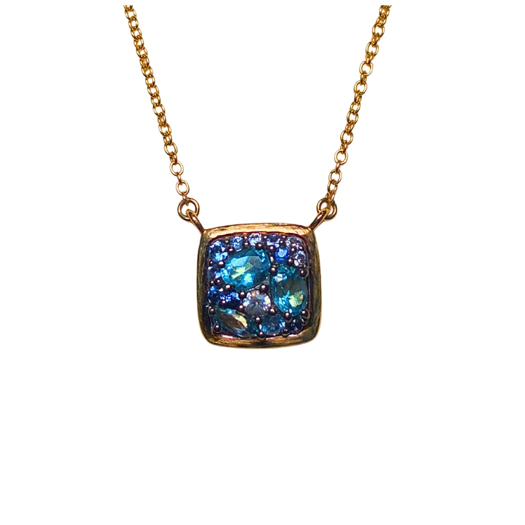 This 14K yellow gold cluster pendant necklace showcases a stunning mix of light to dark blue hues with cushion-cut blue topaz and sapphire gemstones totaling 0.84 carats. The dynamic color gradient creates a captivating sparkle that evokes the beauty of the ocean. Suspended from an 18-inch chain, this piece blends modern design with timeless elegance—perfect for layering or wearing solo.
