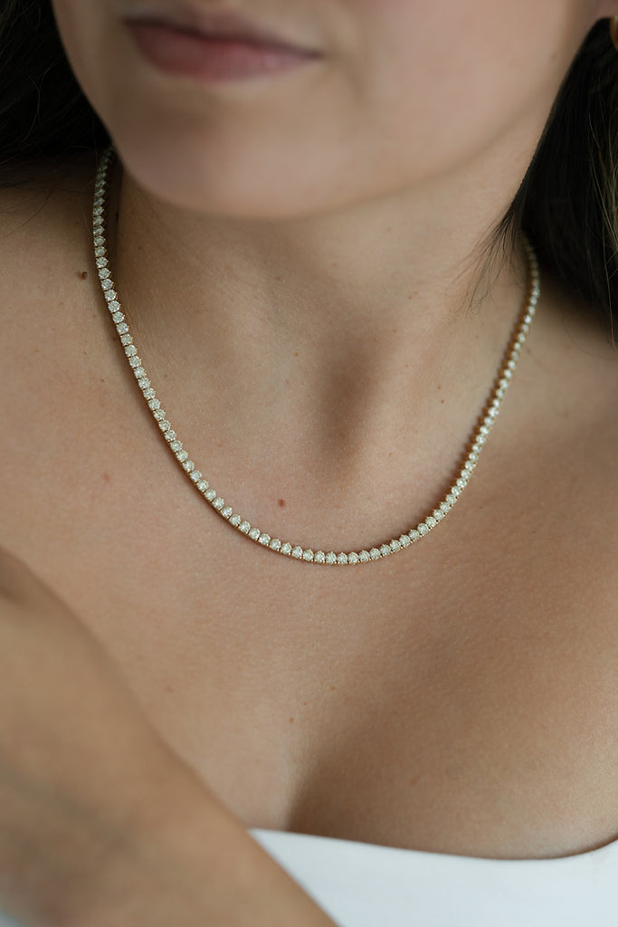 A true classic, this 14K yellow gold diamond Riviera necklace dazzles with 140 round brilliant-cut diamonds totaling 12.50 carats. Designed in a timeless 17-inch silhouette, this necklace offers incredible sparkle and elegance, making it the ultimate statement piece for both everyday luxury and formal occasions.