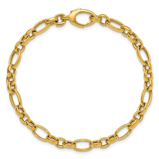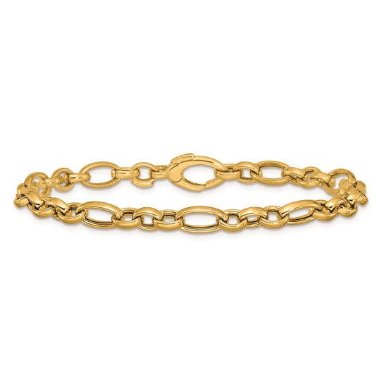 This 14K yellow gold bracelet features a stylish mix of polished oval links, creating a dynamic and timeless look. Its lightweight yet bold design makes it perfect for layering or wearing solo as a statement piece. A classic accessory for elevating both casual and dressy outfits.