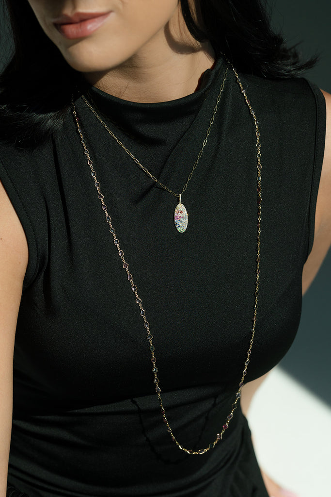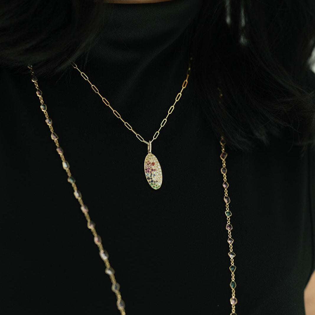 Design: Oval disc pendant with a rainbow-inspired arrangement of diamonds and multi-gemstones for vibrant sparkle