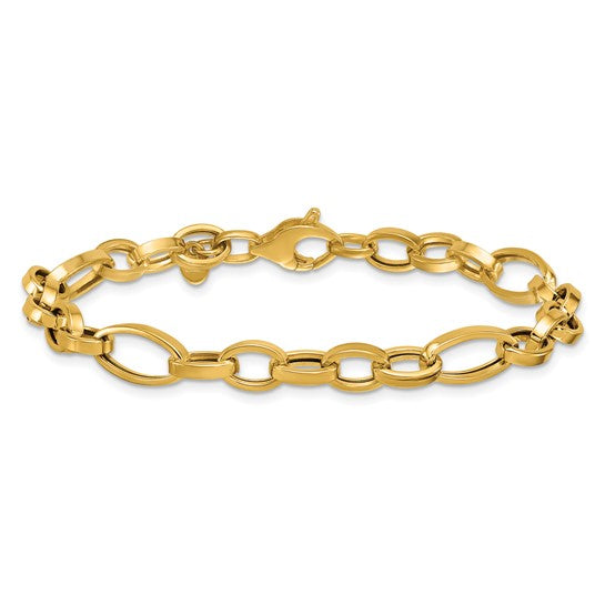 Elevate your wrist with this 14K yellow gold polished fancy oval link bracelet, designed to blend elegance with everyday versatility. The carefully crafted oval links reflect light beautifully, creating a subtle shine that complements any outfit. Perfect for layering with other bracelets or wearing alone, this piece adds refined style and effortless sophistication to your jewelry collection.