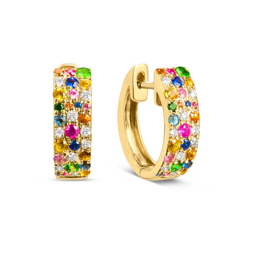 These diamond and rainbow gemstone huggies in 14K yellow gold are a cheerful and versatile addition to any fine jewelry collection.