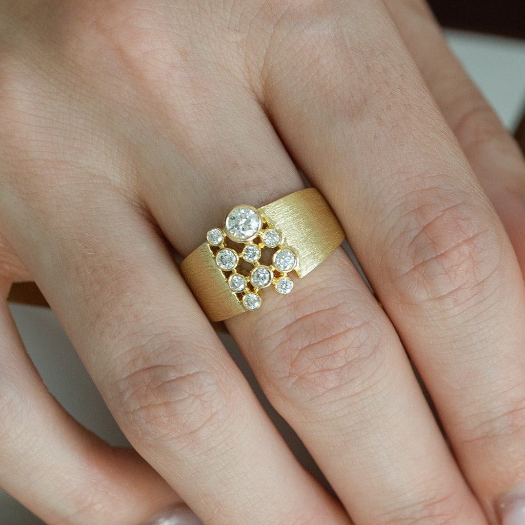 Crafted in warm 14K yellow gold, this wide band features a bold yet refined design with bezel-set diamonds that radiate brilliance from every angle. Modern and elegant, it’s the perfect piece for those who appreciate timeless luxury with a contemporary edge.