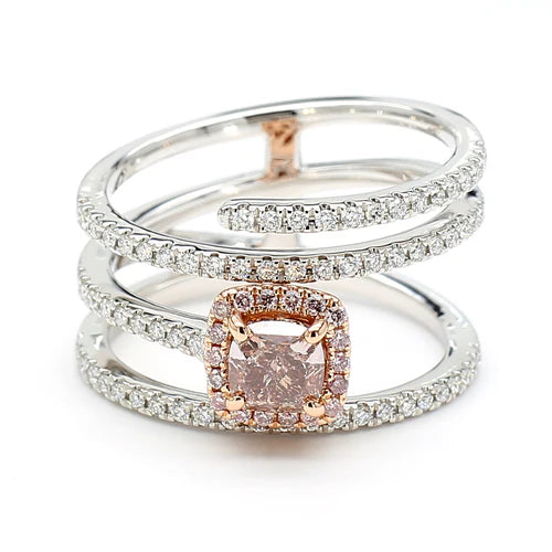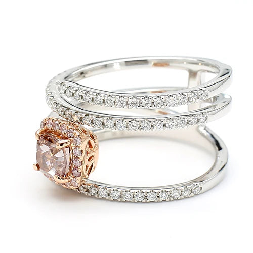 Striking and distinctive, this 18K two-tone diamond ring showcases a captivating cushion-cut fancy pinkish-brown diamond at its center, creating a warm and unique focal point. Surrounded by a delicate halo and additional round diamonds along the band, the design enhances the center stone’s natural color while adding layers of brilliance. Crafted to highlight both contrast and sparkle, this ring offers a bold yet refined look that stands beautifully as a statement piece.