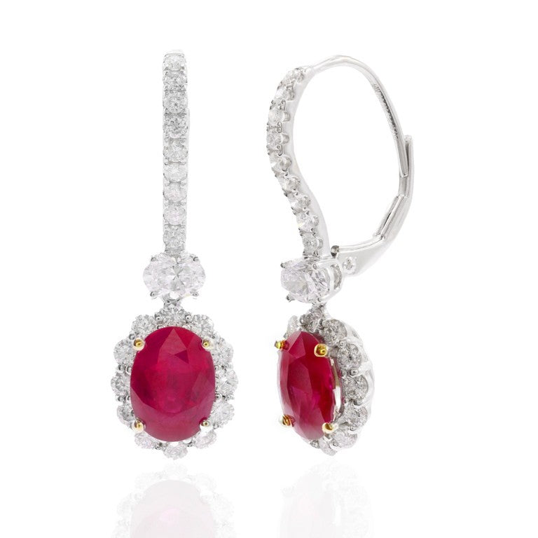 Design: Two-tone drop earrings featuring oval rubies framed by brilliant diamonds