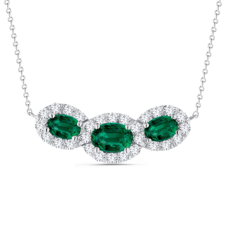 Elegant and timeless, this 18K white gold pendant showcases three oval-cut emeralds totaling 1.33 carats, radiating a lush medium-green hue. The design is beautifully enhanced by 28 round brilliant-cut diamonds totaling 0.51 carats, adding a sparkling contrast that highlights the natural vibrancy of the emeralds. Suspended gracefully from an 18K white gold setting, this pendant embodies sophistication and refined luxury.