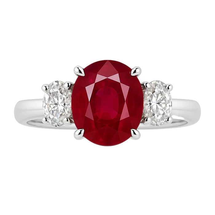 Gemstones: 1 Oval Ruby (2.01ct) + 2 Oval Diamonds (0.40ctw, F–G color, VS clarity)