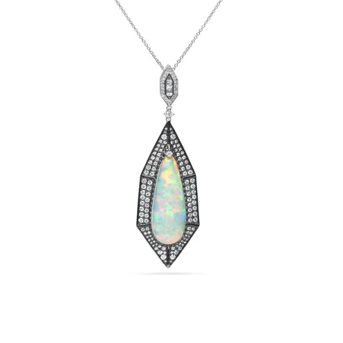 Make a luminous statement with this 18K white gold pear-shaped opal pendant, showcasing a mesmerizing opal with vibrant flashes of color. Surrounded by a halo of sparkling diamonds, the design enhances the opal’s natural play-of-color while adding brilliance and contrast. Elegant and eye-catching, this pendant is perfect for special occasions or adding a standout piece to your collection.