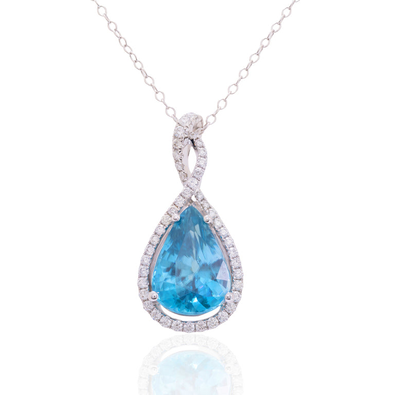 Design: Pear-cut blue zircon surrounded by a diamond halo in high-polished white gold