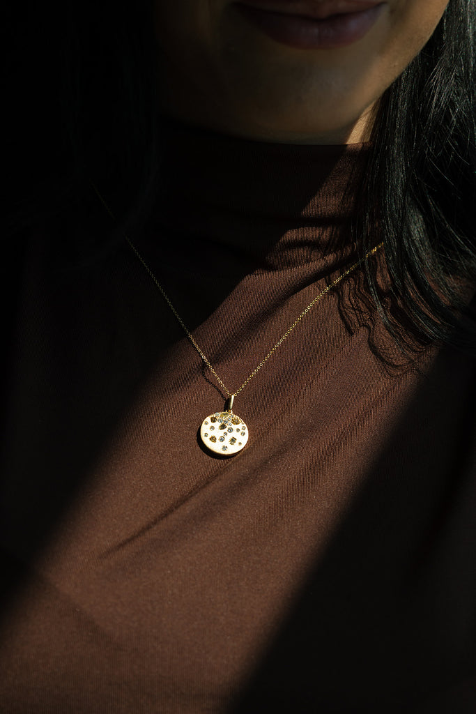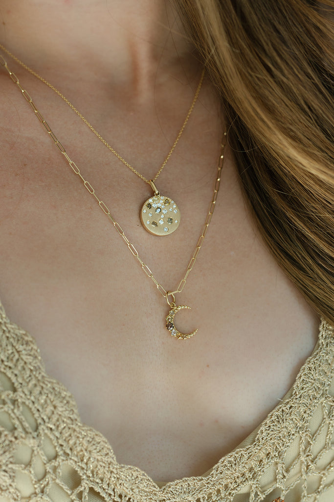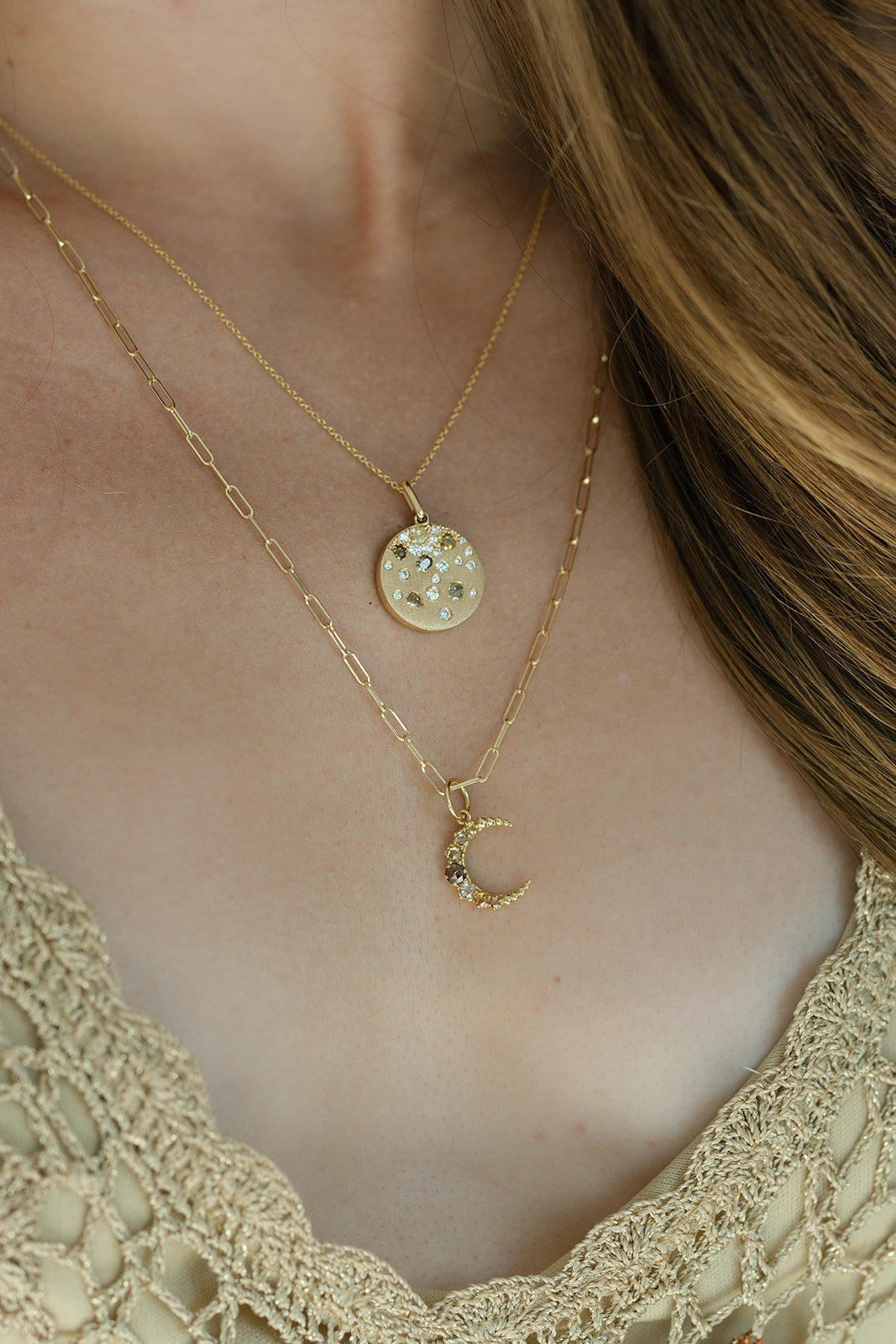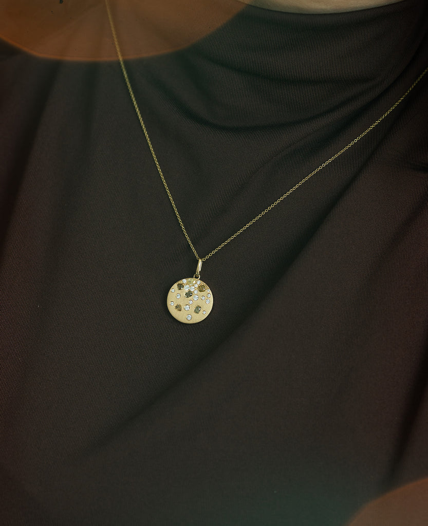 This 18K yellow gold disc pendant necklace shines with a mix of rare natural fancy color diamonds and classic round brilliant-cut diamonds, totaling 1.03 carats. Set on an 18-inch chain, the pendant balances contemporary design with timeless sparkle, making it an eye-catching statement piece for any jewelry collection.