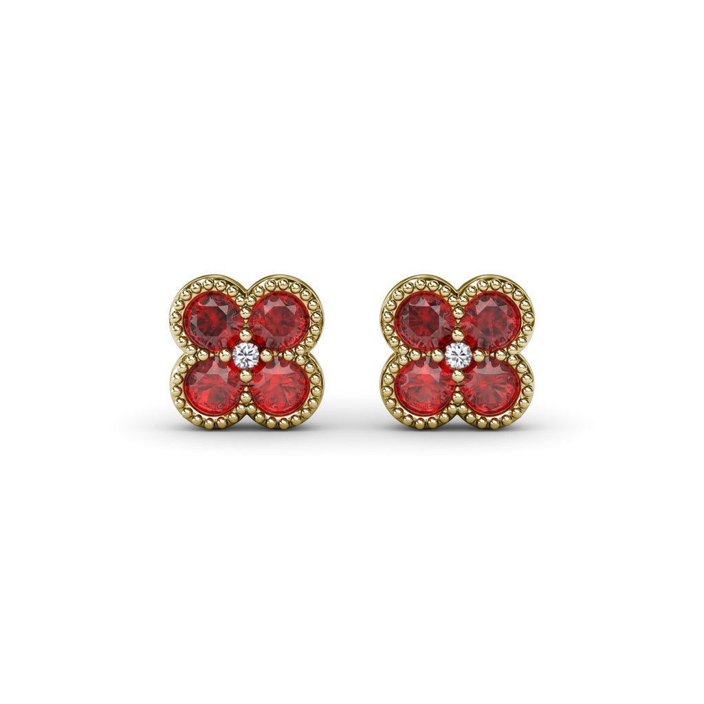 Crafted in 14K yellow gold, these ruby and diamond earrings feature eight vivid round rubies totaling 1.04 carats. Two round brilliant-cut diamonds (0.03 ctw, G color, VS2 clarity) add a delicate hint of sparkle. A refined cluster design that offers rich color and effortless sophistication.