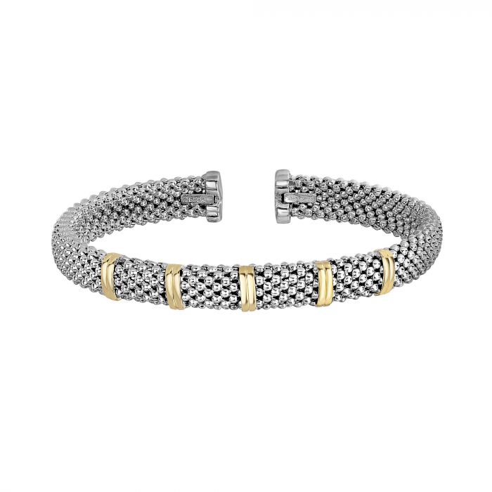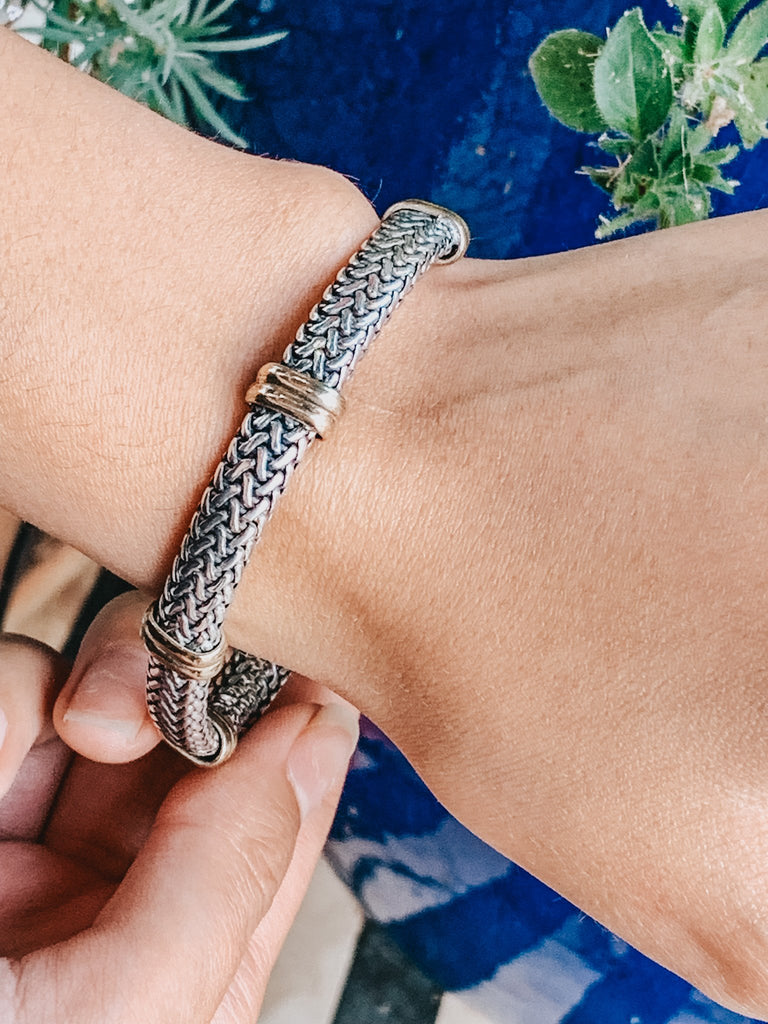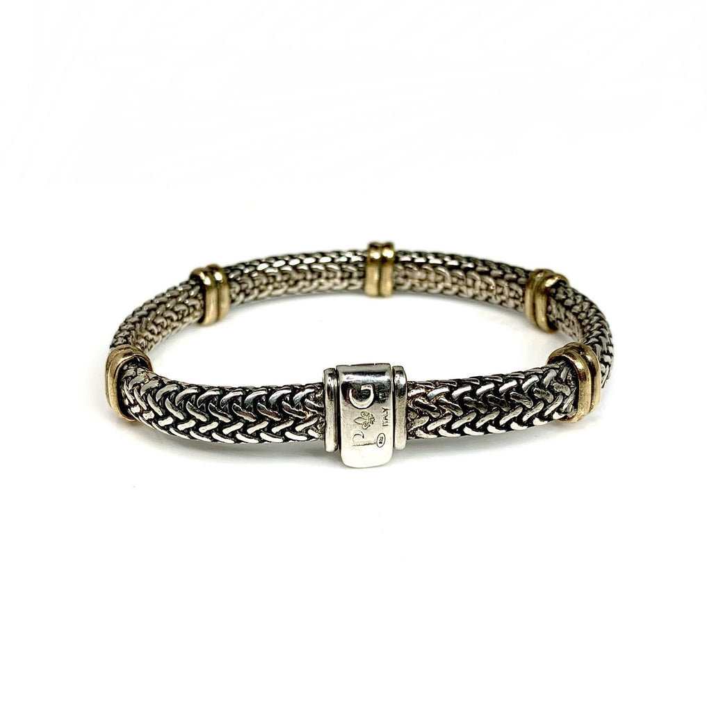 This exquisite Tuscan woven bracelet expertly blends sterling silver with 18K yellow gold accents, creating a timeless piece that exudes both luxury and artisanal craftsmanship. Designed for a 7" wrist, it’s an elegant statement suitable for everyday sophistication or special occasions.
